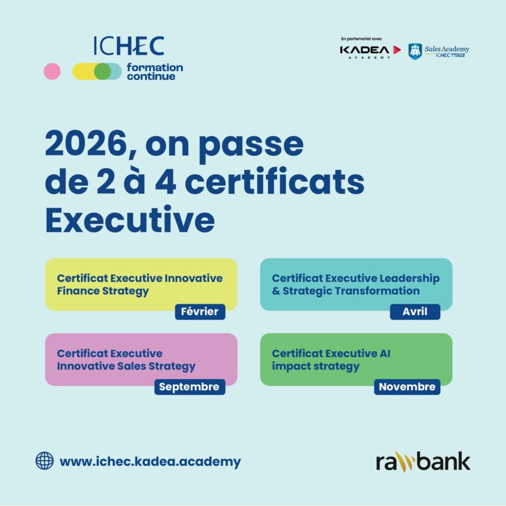 ICHEC Formation Continue, le pôle de formation continue de l’ICHEC Brussels Management School, inaugure une nouvelle phase de son développement à Kinshasa en 2026. Fort d’une reconnaissance académique internationale et d’une expérience de plus de six décennies dans la formation en management, l’ICHEC propose des programmes Executive de haut niveau, déjà bien implantés en Belgique et désormais adaptés aux réalités congolaises. Le programme Executive à Kinshasa passe ainsi de deux à quatre certificats, offrant aux dirigeants, cadres et managers des secteurs public et privé des formations spécialisées et immédiatement applicables, tout en conservant la rigueur et la qualité pédagogique reconnues à l’international des programmes ICHEC.